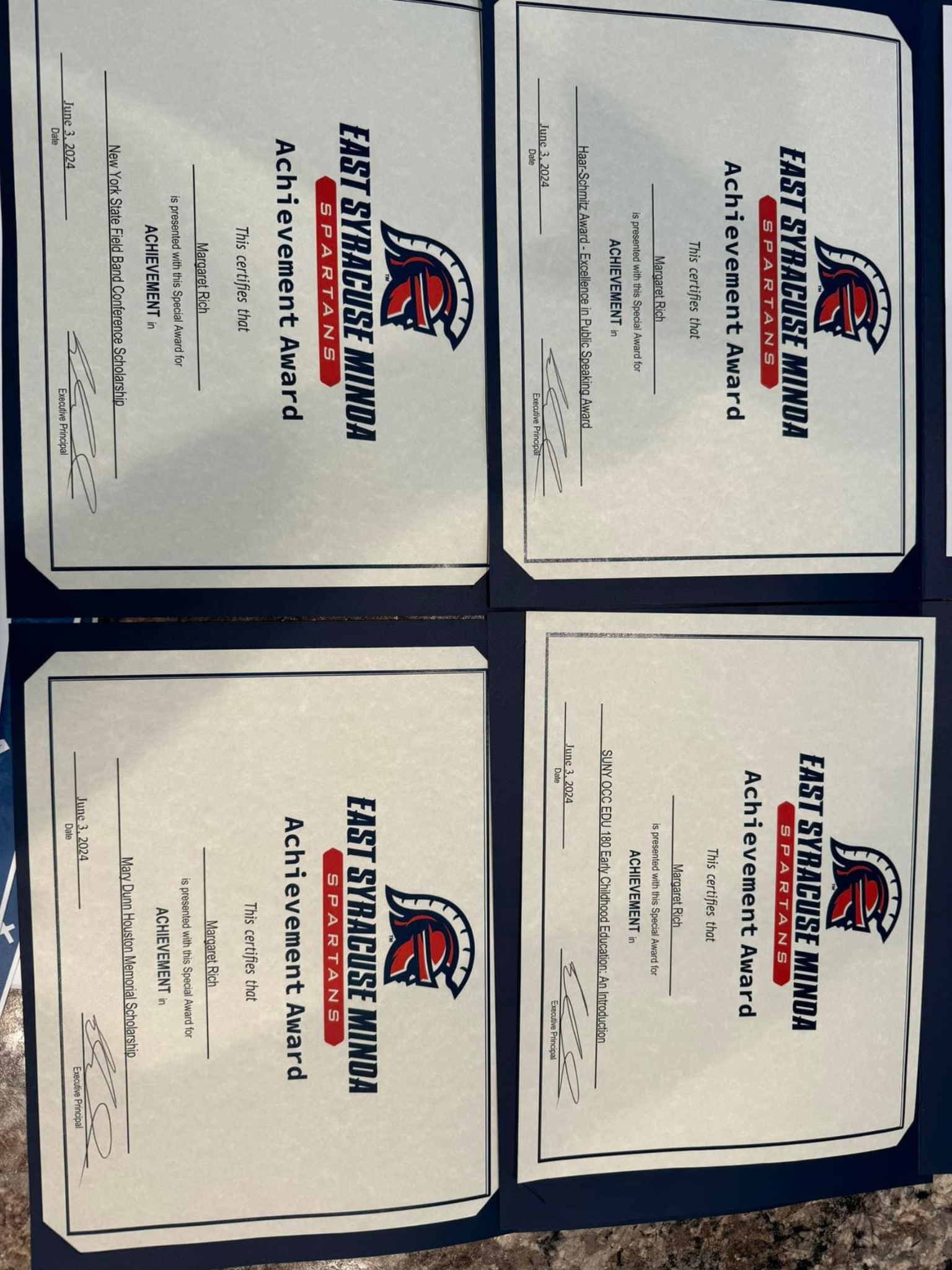My name is Maggie Rich. I am a senior at East Syracuse Minoa High School, and I will be attending SUNY Geneseo this fall, majoring in Early Childhood Education. I am a student in our Early Childhood program, and I love starting every morning in a room full of fun-loving kids. Building relationships with the students has been my favorite and most memorable part. I also babysit three autistic children, two of whom are nonverbal. Additionally, I have a twin brother who is autistic. Growing up with neurodiversity all around me has made me want to make a difference in education, particularly for special education students.I am a member of the National Honor Society, National Technical Honor Society, and I am the Vice President of SkillsUSA at our school. In my competition this year, I presented a lesson plan on a topic I was assigned an hour before. SkillsUSA was a great opportunity to see what my future workforce may look like. Being a student-athlete is alsosomething I am very passionate about. As a member of two varsity-level teams, I also coach 3rd-5th graders in color guard. Being well-rounded is an important trait to me.